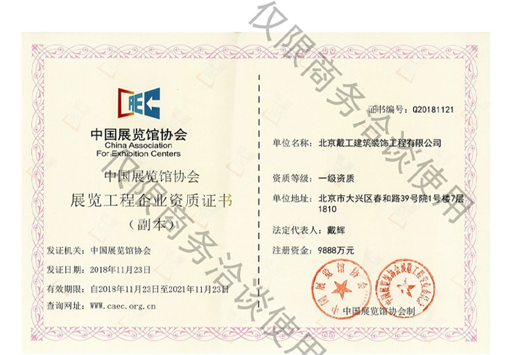 戴工建設集團有限公司,創建于2009年,注冊資本9888萬元人民幣。公司位于北京市大興區。具有建委頒發的建筑裝飾裝修專業壹級,防水保溫工程專業壹級,建筑幕墻專業貳級,消防設施專業貳級,電子與智能化專業貳級,特種工程(結構補強)專業不分等級,建筑機電安裝專業貳級,環保工程專業貳級,鋼結構專業貳級,建筑工程總承包貳級,建筑裝飾工程設計專項甲級,展覽陳列工程設計與施工壹級,展覽展示工程壹級...更多>>